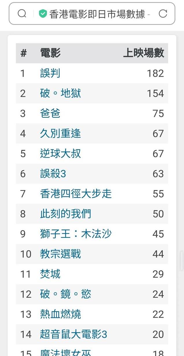 纪录片《香港四径大步走》,由李云婵执导,排映55场,吸引2101名观众,单日票房20.5万港币。上映仅9天,总票房已累计达到236万港币,位列当日票房榜第三。