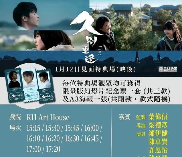 《久别重逢》,由叶伟信监制,梁礼彦导演,主演为郑伊健、陈卓贤、许恩怡和蔡思韵,筛选67场,观影人次达1157人,单日票房10.1万港币。累计票房848万港币,周末将举行大规模的谢票活动。