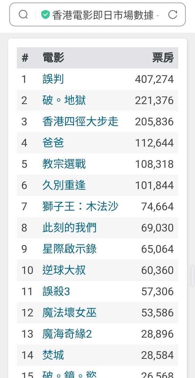 位居票房榜首的是电影《误判》,由黄百鸣和甄子丹共同监制,甄子丹不仅自导自演,还与张智霖、吴镇宇、许冠文和张天赋等演员携手合作,郑则仕和刘江参演,吕良伟和郑浩南特别出演。这部犯罪动作片共排映182场,吸引4880名观众参与,当日票房高达40.7万港币,自上映以来,总票房已突破2200万港币,成功挤进2024年度的香港电影票房榜前八名。